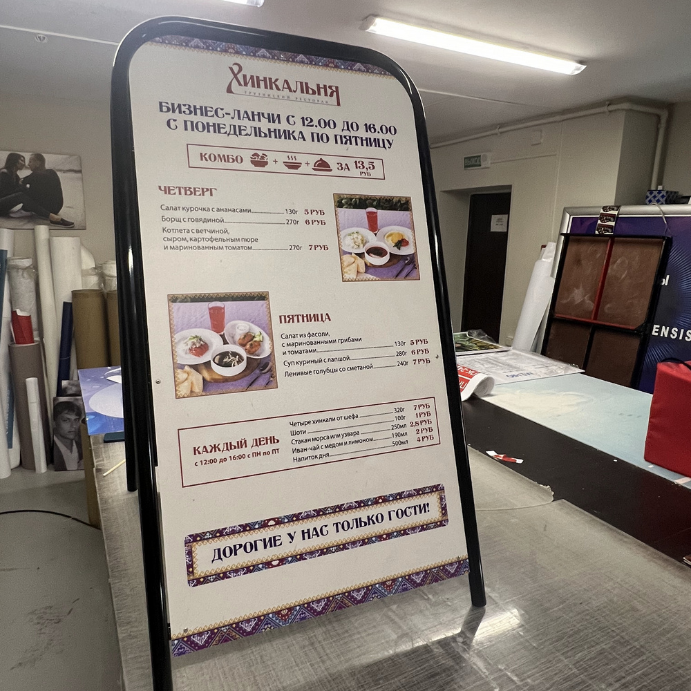 Прямоугольный двухсторонний штендер сам по себе, это классическое универсальное решение для размещения рекламы или указателей как в открытой среде, так и в интерьере. Отличительной особенностью двухстороннего штендера является универсальность отображения информации. Мы изготавливаем рекламное поле штендера из прочного материала устойчивого к погодным условиям.